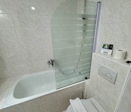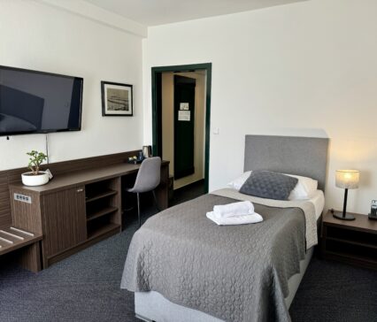 Modern eingerichtetes Zimmer im Standard: ein Kleiderschrank mit einem Abstellraum im Eingangsflur, Badezimmer mit einer Badewanne und Toilette, Fön, Badetuch, Handtuch, Lampe auf dem Nachttisch, Telefon, Radio, Fernseher mit mehr als 30 Sender, Kühlschrank, Sessel mit einem Konferenztisch, Stehlampe.
