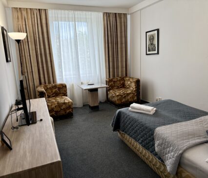 Originally equipped room including a wardrobe and cabinet in the vestibule, a bathroom with the bathtub and toilette, hairdryer, towels, hygiene accessories, bedside lamp, telephone, TV with broadcasting up to 30 channels, fridge, minibar, standing lamp and chairs with coffee table.